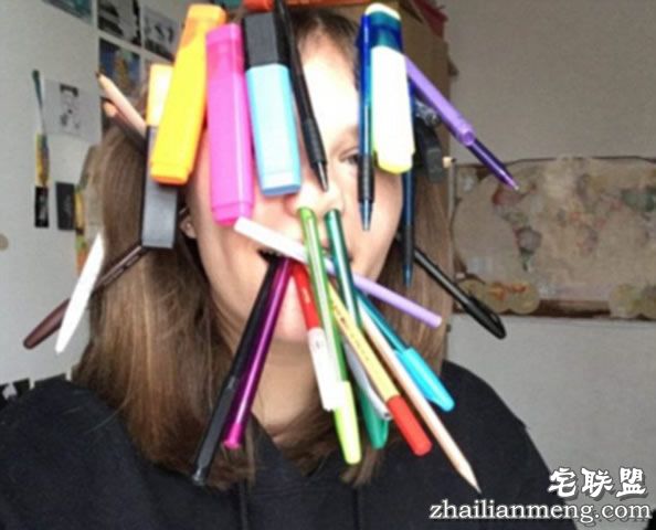 英格兰最近流传一段笔战,一名少女在念书时突然搞怪,想测试自己头上可以插上多少文具。事后自己就拍了一张搞怪照上传到自己的twitter,结果却意外地引发好友宣战,对方最后一共插上242支笔,少女才宣布认输。