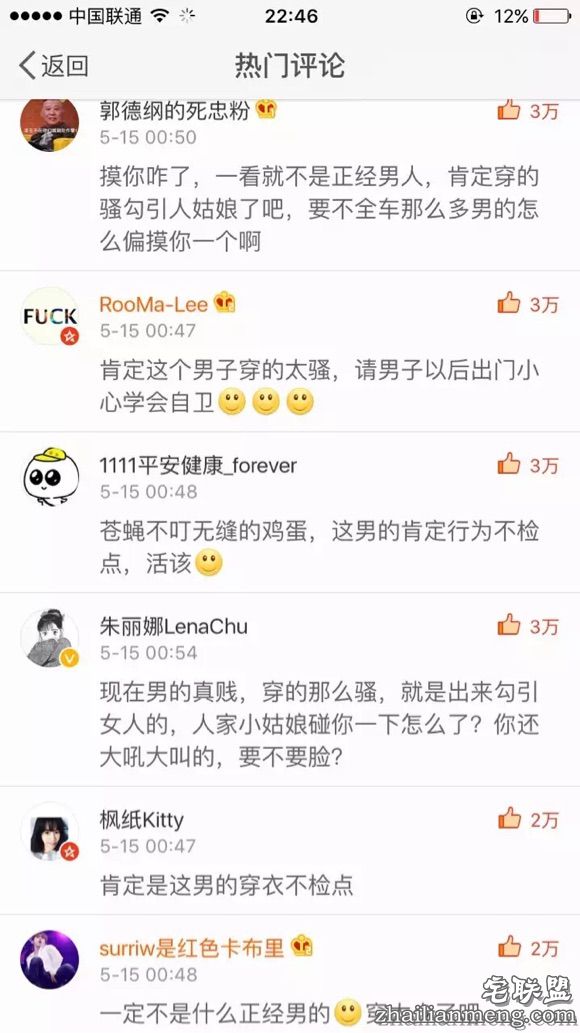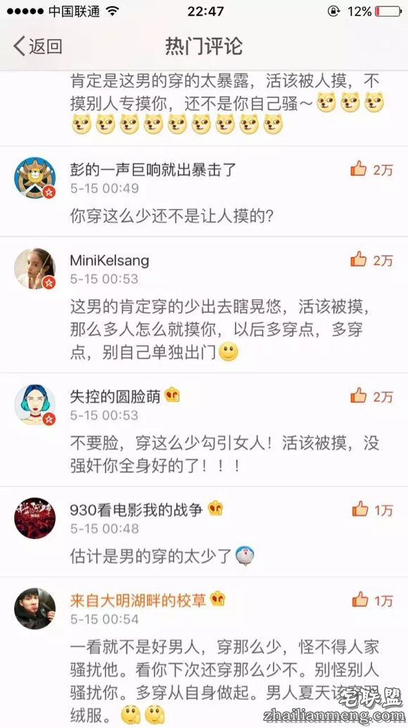 肯定是这个男的穿的太露了,要不然干嘛只摸你不摸别人,男人就该呆在家里,出来勾引谁呢!