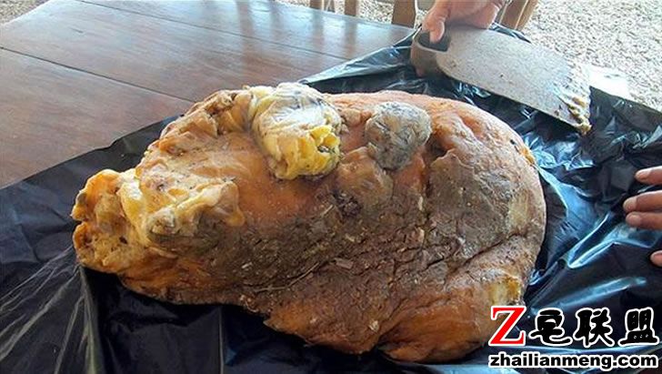 它在阳光照射下呈现出光泽,长约50公分、重达10公斤,而且摸起来有些柔韧,有点像是蜡的触感,而闻起来甚至有些鱼腥味。