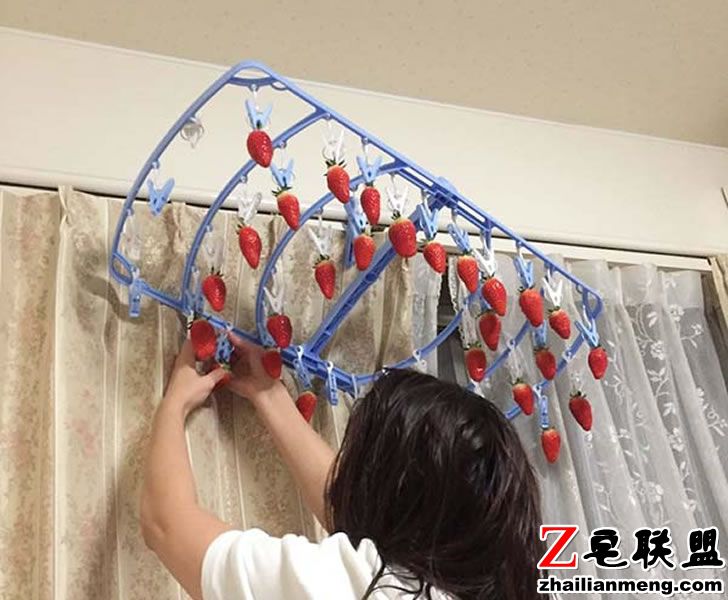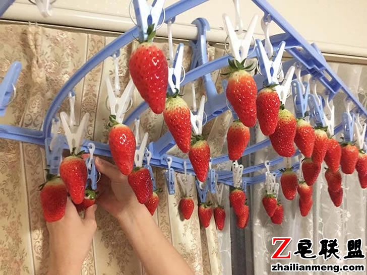 女友先是买了一盒现成的草莓,接着拿出家中的晒衣夹,把它悬挂在居室的高处,再将草莓一颗颗“夹上去”,最后看起来就像是个迷你、居家版的草莓园一样,让 rikujimasukuman 感到有些愧疚,却也相当惊喜。