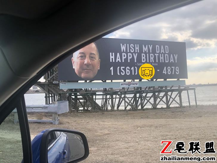 这块广告牌广告于6日架设在往大西洋城的公路旁,以庆祝老爸9日的62岁生日。广告牌写着:祝我爸生日快乐,爱你的儿子们。要大家打电话祝生日快乐。