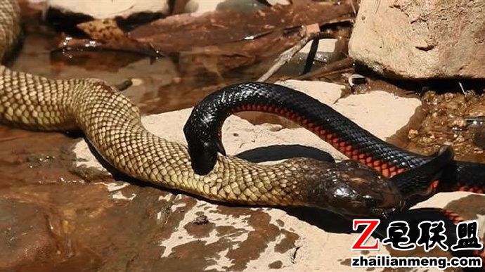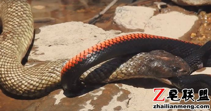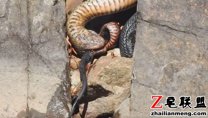 澳大利亚女子 Jenny Hillman 当天正在昆士兰州波兰甸塞文河附近散步,意外发现河边的岩石缝中竟有两条蛇正在激烈地相互撕咬着。