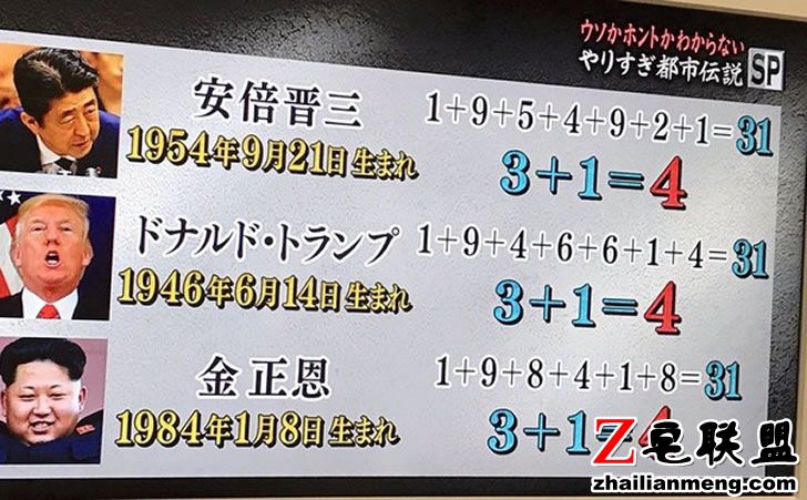 小日本电视节目以《生命灵数》分析性格,其中提到,安倍晋三是1954年9月21日生日、特朗普是1946年6月14日生日、金正恩则是1984年1月8日生日,3个人的生命灵数皆是4,而性格则是,能干的领导者,但冷酷没有人情味。