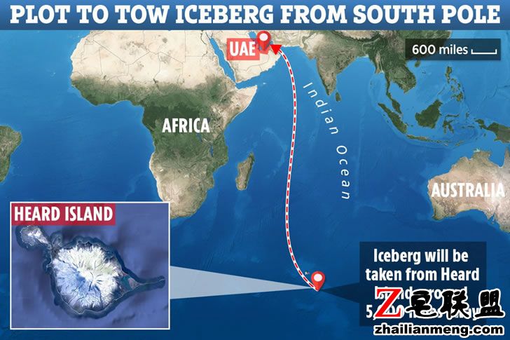 阿拉伯富豪 Abdulla Alshehi 计划要从赫德岛把一座长1.92公里、宽500公尺的冰山,拖行超过8800公里,一路回到深受干旱所苦的中东地区。