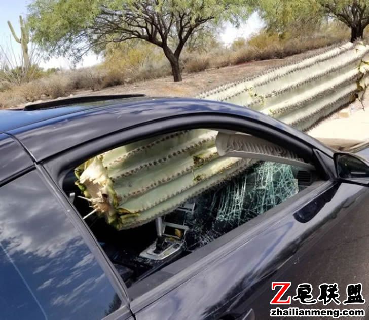 Scott 表示,他路过 Tucson 路段时,汽车突然失去控制,直接冲向路旁一株巨型仙人掌。坚硬的仙人掌当场插进挡风玻璃内,幸好当时副驾驶座没有乘客,否则应该会被这“狼牙棒”般的仙人掌挤扁。