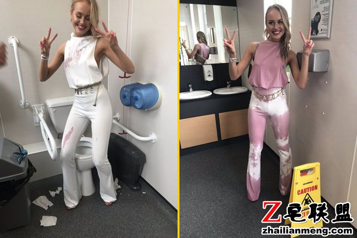 到厕所想要清理却越弄越糟,正在烦恼该怎么办的时候,她的朋友 Mia Williamson 突然灵机一动,拿了更多红酒当作染料,将一身雪白的连身裤瞬间改造成粉红色跟白色相间的新设计。