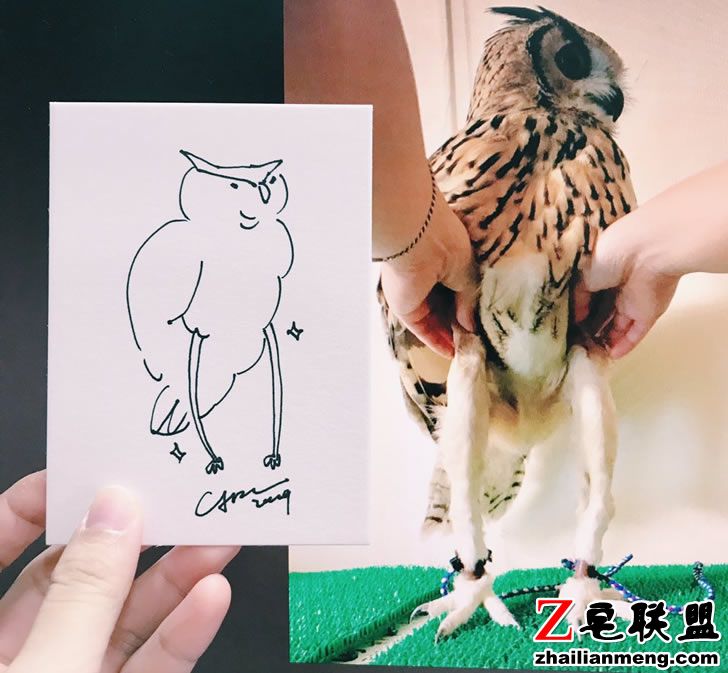 随后附上两张照片,一张照片是猫头鹰原本的样子,另外一张则是撩起羽毛后,猫头鹰露出的“修长美腿”。