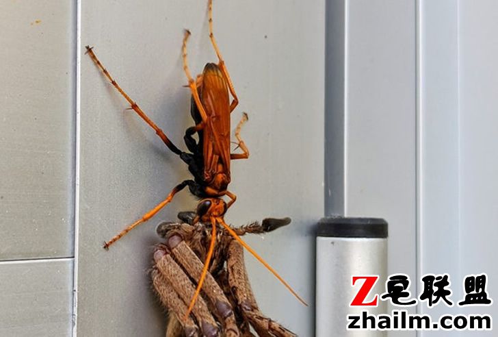 澳大利亚一位网友表示当天下班回到家时,看见自家门上出现2个不速之客,再仔细一看,橘色蛛蜂正在吞食比自己身体大上约2倍的猎人蜘蛛,当时马上拿起手机拍下这罕见的一幕。