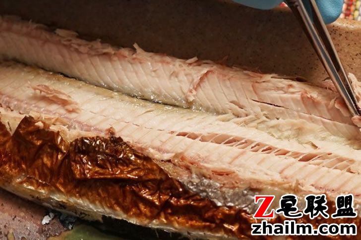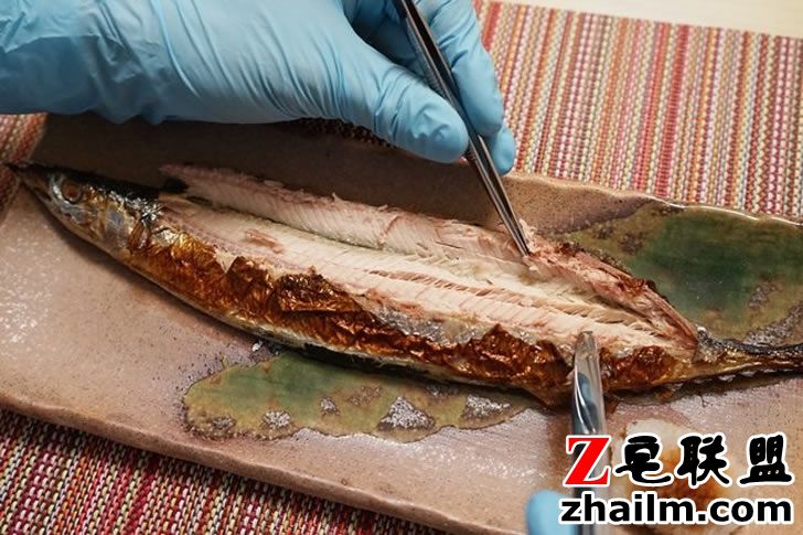 再用全新的手术刀,从秋刀鱼的鱼骨旁切下,掀开鱼肉后可见,刺与鱼肉已完美分开。
