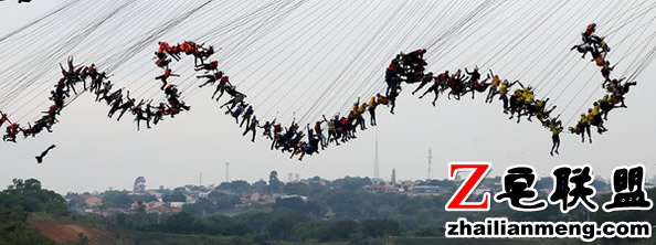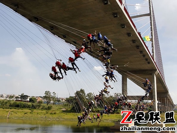 245名极限运动爱好者相约在巴西圣保罗Hortolandia 一座高达30多公尺大桥上蹦极,时间一到全体跳下。