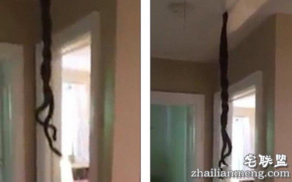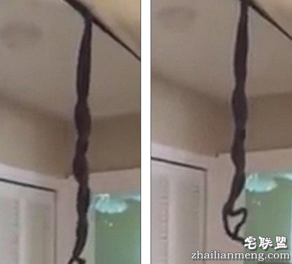 美国南卡罗来纳州男子马克回家时打开门傻眼了,看到两条蛇缠在一起悬挂在天花板上,还不时的扭动,看到这一幕吓了一跳,蛇怎么会在这里?关键是这两条蛇也不走咋办,他决定一边有手机拍摄一边拿扫帚把蛇挑到后院去。