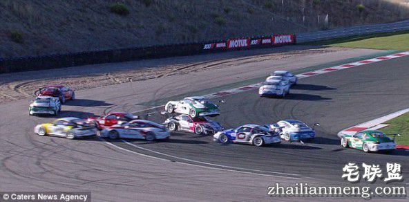 西班牙的纳瓦拉赛道时捷卡雷拉杯比赛,大约有20多辆车在赛道上飞奔,一辆保时捷在拐弯时被另一辆车撞倒尾部后直接来了一个180度的大转弯。