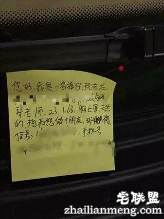 一张黄色便条纸在车窗左侧,上头内容写道:“您好,我是一名海归(留学海外归国),现在在做钢琴老师,23.168。胸E罩,天然的,想和您做个朋友,我微信号。。。手机号。。。”。