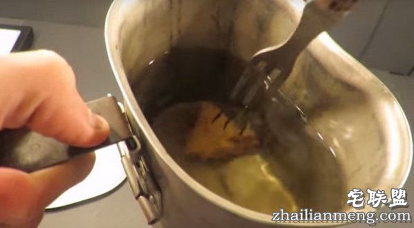 小哥灵光一闪,想到了当年军人们是把饼干放进咖啡里面泡,一起食用的,他决定也这么试一下