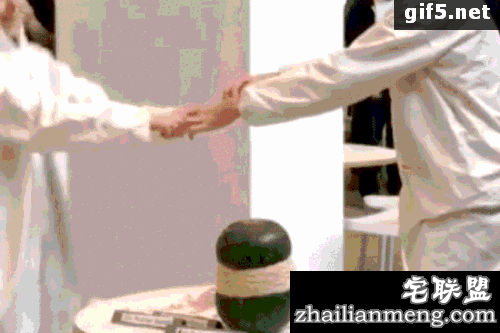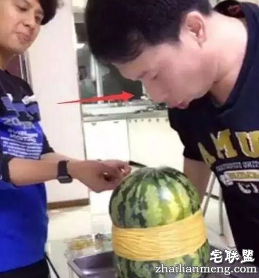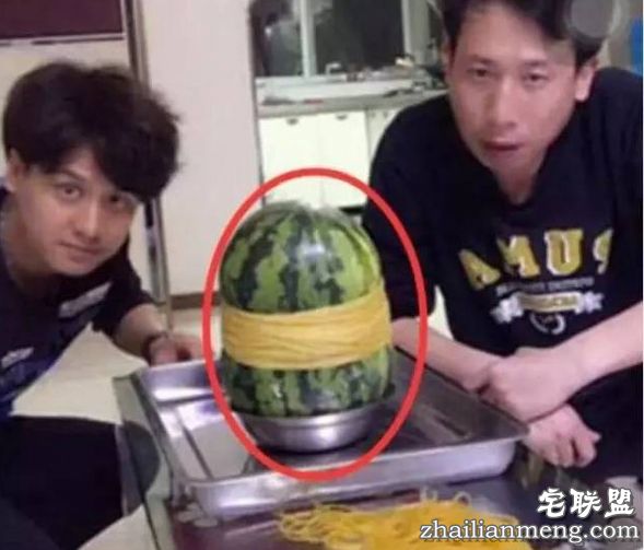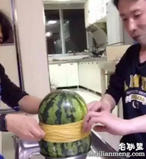这二人没有佩戴任何防护装备,围坐在一个西瓜前,开始一根一根为西瓜套橡皮筋。
