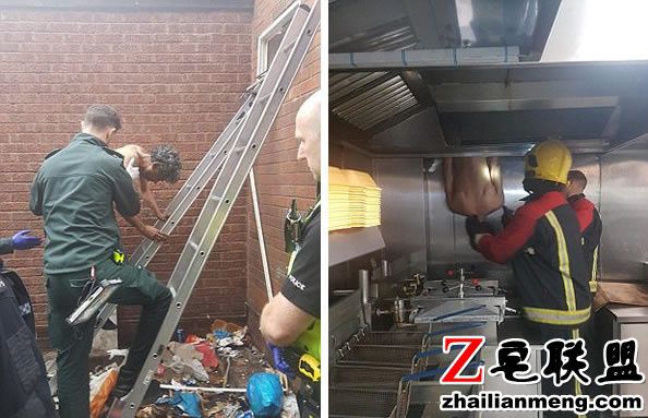 英国伯明翰一名45岁小偷企图“光顾”一间炸鸡店,从排烟口钻了进去,但尴尬的是,他上半身钻进去,下半身还没通过时,人竟然就卡住了,进不去也出不来。