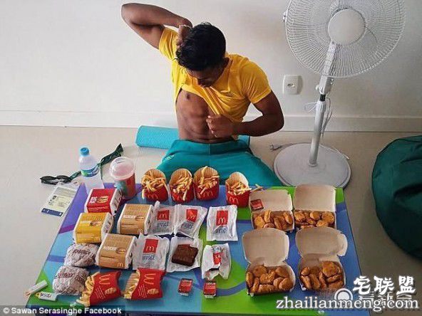 澳大利亚羽毛球男双选手塞拉辛哈在被淘汰后,为了安慰自己受伤的小心脏,决定大吃一顿。他准备了一顿麦当劳盛宴,有麦当劳汉堡包和炸薯条,总热量高达8369卡路里!
