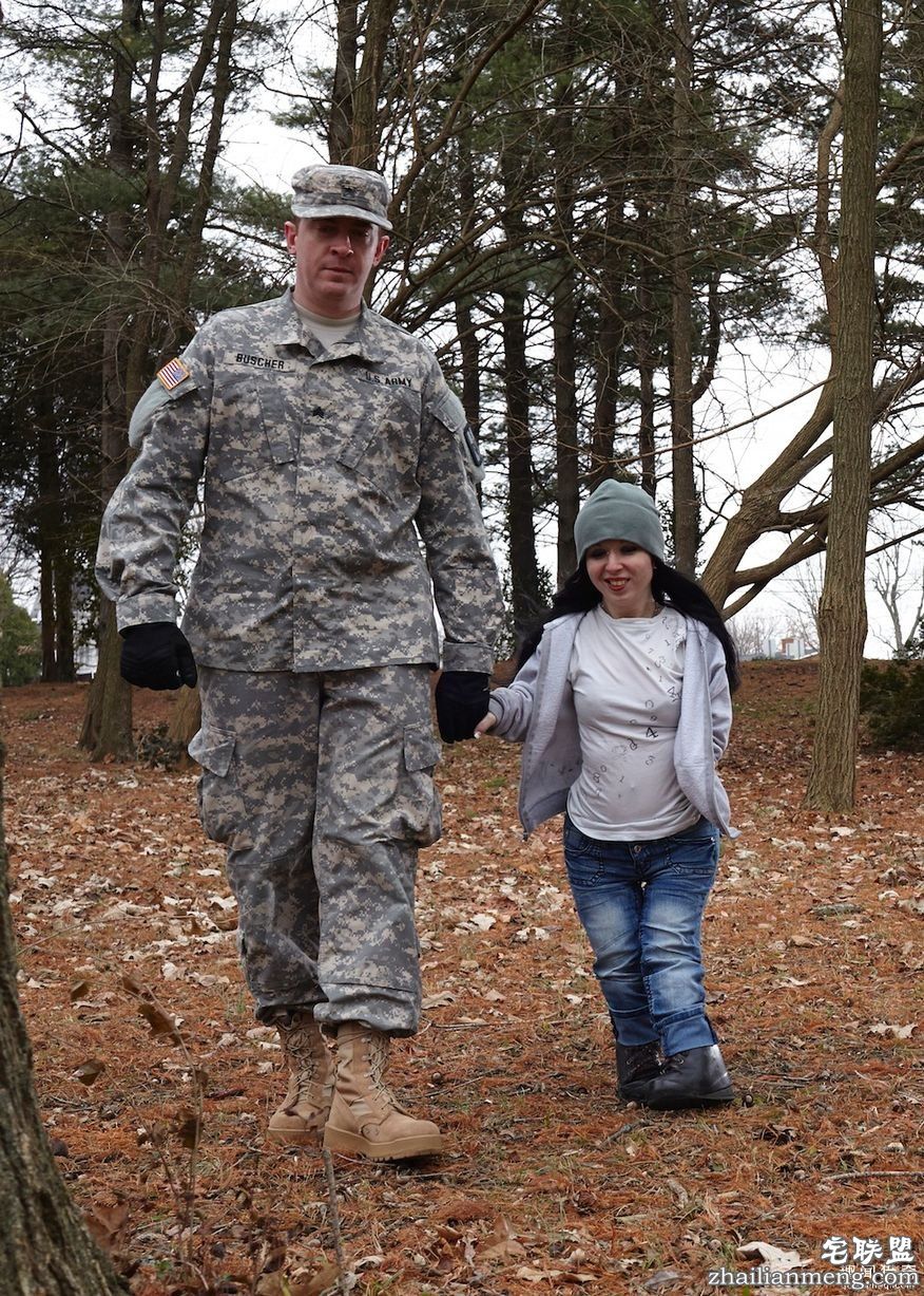 照片里女孩叫做Kat,身高不到一米二,是一名酒吧里的脱衣舞娘。身边的这位高大军官是Kat的男友。(照片里男友领着Kat一起在树林里散步。)