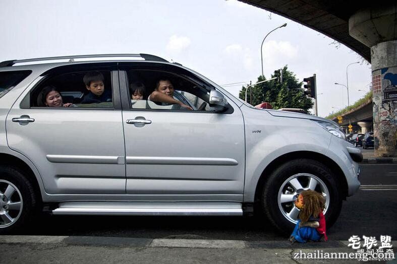 带着面具的猴子在路边为过往的车辆表演,车里的人被猴子奇怪的打扮逗乐了。