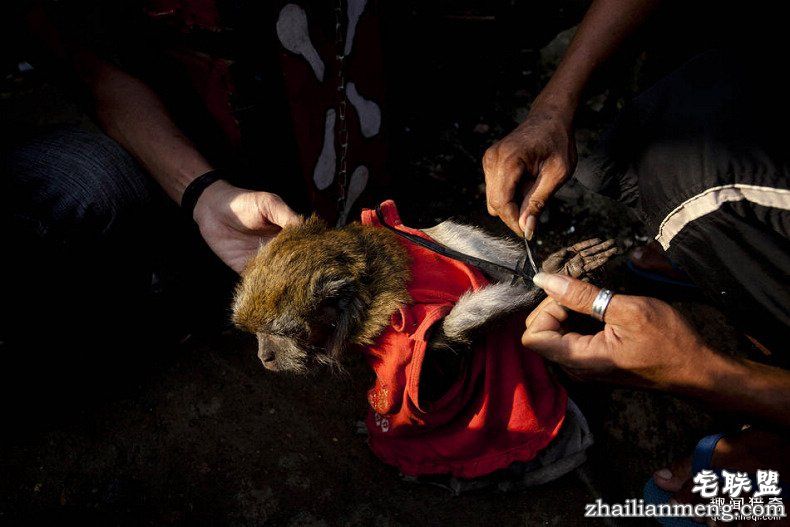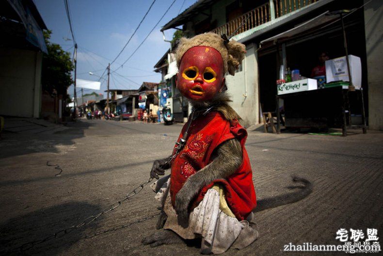 这些耍猴人为猴子戴上面具,使它们看起来更像儿童,因为这样会更受观看者的欢迎。