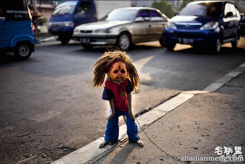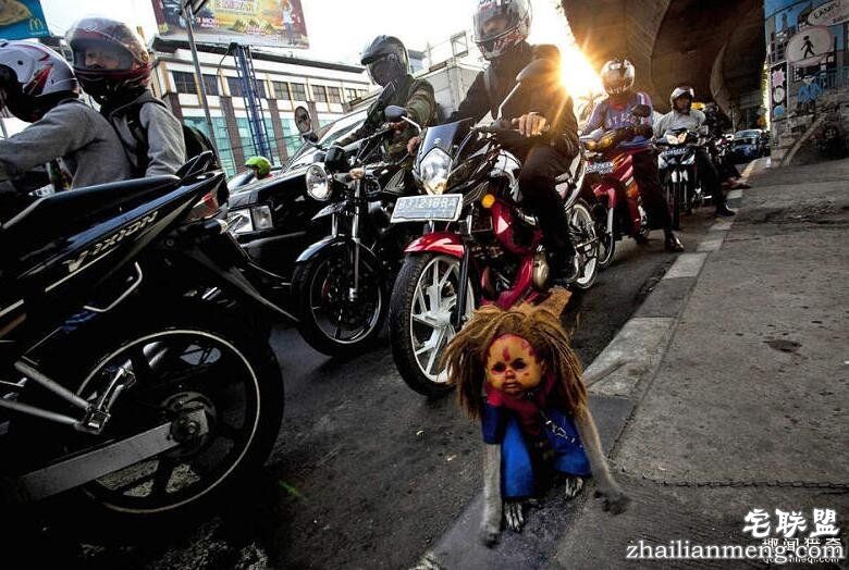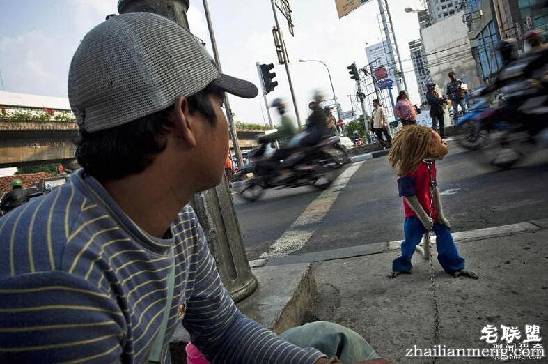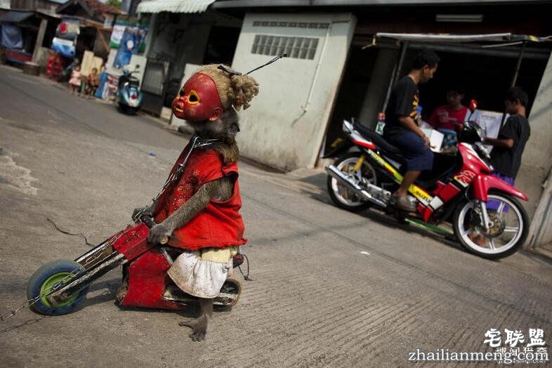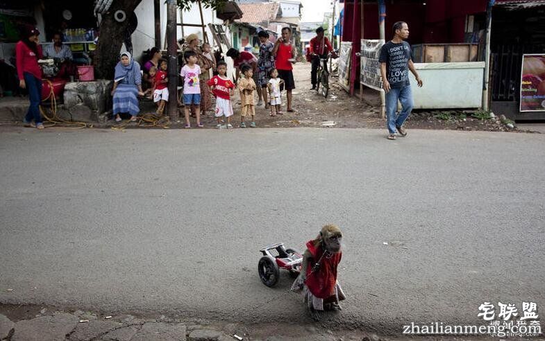 在印尼雅加达的大街小巷里,时常会看到一些耍猴人挑着他们的行头,领着训练好的猴子到处行走为人表演,以收取微薄的报酬。