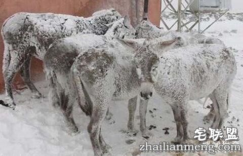 几只驴凑在一起,只有依偎在一起才能互相取暖!仔细看,驴的身上竟然还有冰柱,冷冻成这样了!