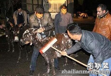后面这只驴的脸已经被冻成一个面具了快!全部都被白雪覆盖了,后面那只驴的身体都是雪痂!