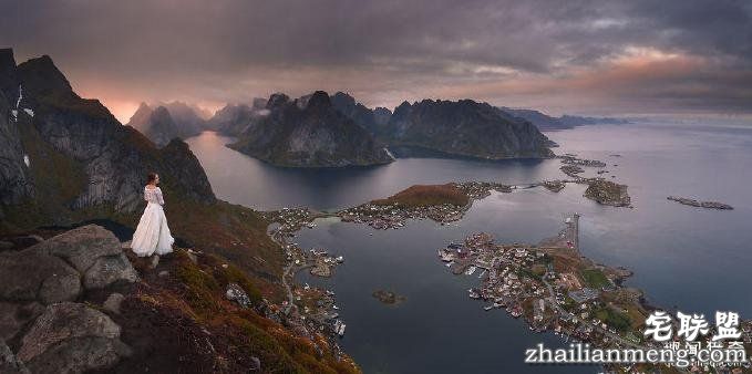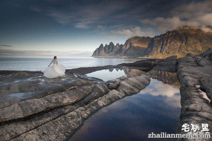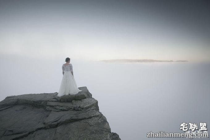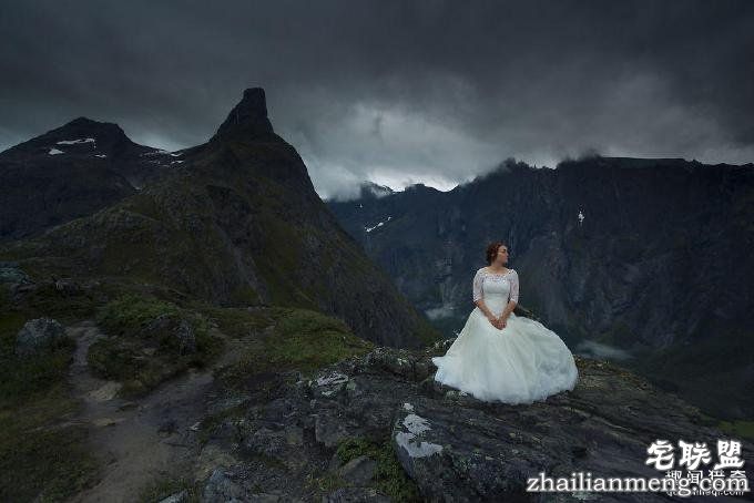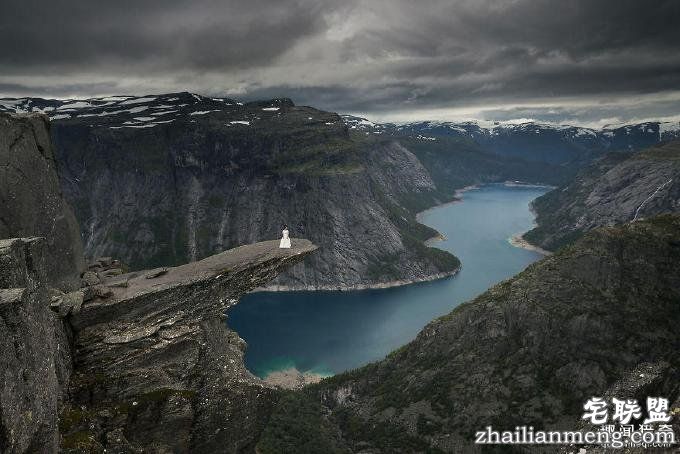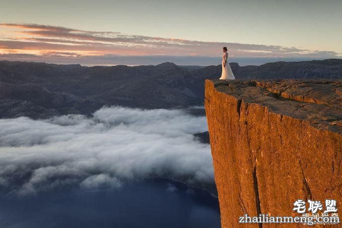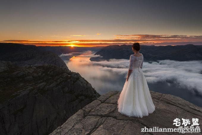 图为新娘在挪威的巨舌岩(Trolls tongue)。