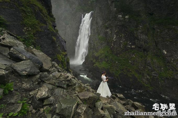 图为新娘在瀑布前的照片,有前拉斐尔派绘画的影子。