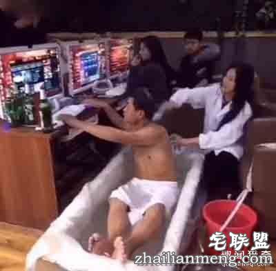 不仅如此,他还喝着啤酒,打着游戏,不一会儿,连美女技师也过来帮忙搓背、洗头等。