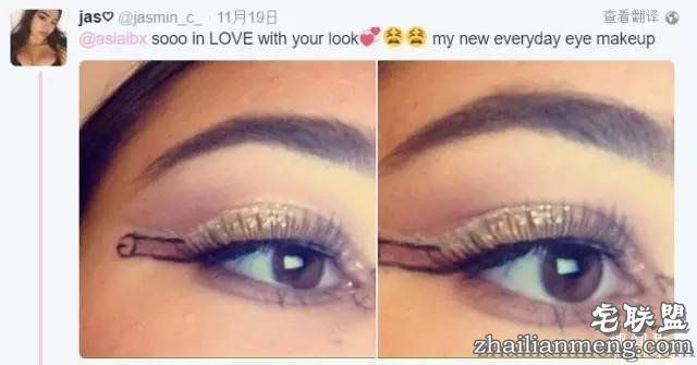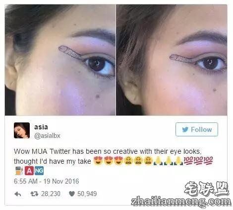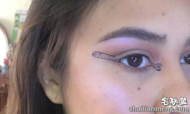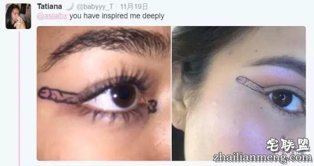 网络上什么鬼都有。比如有个19岁的女孩,最近就在推特发文,说她画了这样的眼线,是她偶然的创意。