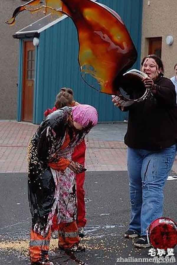 为了庆祝新娘一生中最幸福的这一天,她的亲友会悉数到场,并在新娘身上泼倒各种污秽,比如过期牛奶、剩菜剩饭、烂泥巴、沥青……这还不算完,大家还会使劲把新娘灌醉,之后把她绑在树上让她自己想办法挣脱。这些习俗的初衷单纯且美好:如果新娘面对这些问题时都能从容应对,那婚后有什么问题她会解决不了?
