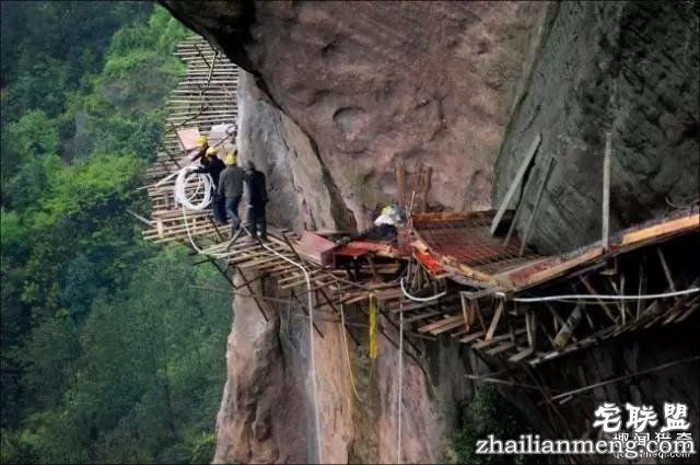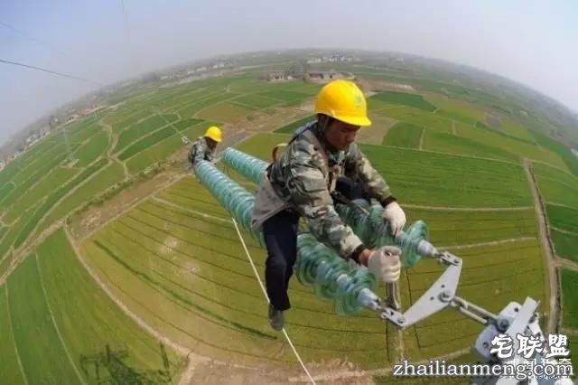 这是中国的电力工人,要在高空安装电缆