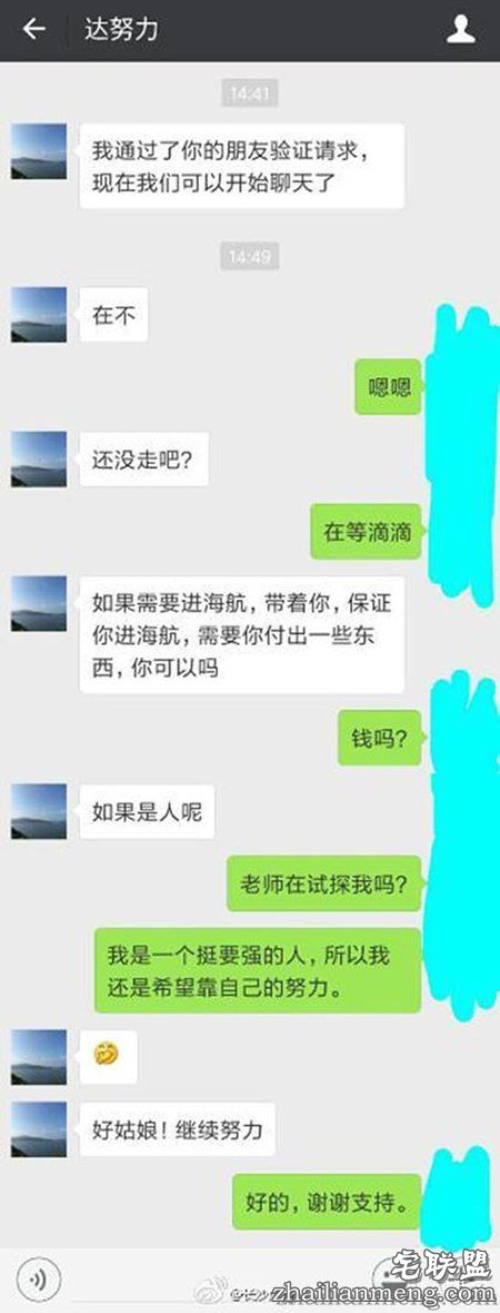 根据《搜狐》、《澎湃新闻网》等媒体报导,22日有网友在微博上传了一系列的对话截图,内容是一位名为达努力的男子,加入一名来应征空服员的女考生为好友,他先是问对方是否已经离开,接着就直接提到:如果需要进海航,带着你,保证你进海航,需要你付出一些东西,你可以吗?