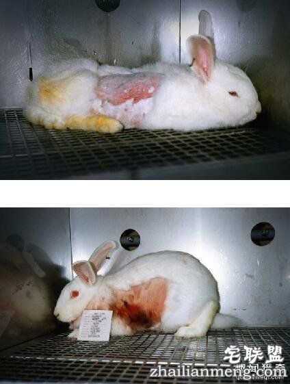 人们将兔子身上的一部分毛剃掉,露出类似人类的皮肤,然后再把安全性未知的化学物品抹到它身上...