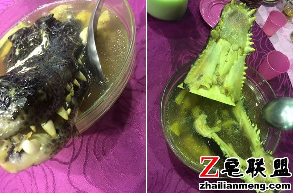 照片中只见大汤碗装有完整鳄鱼头,大小不一的尖牙更是焦点所在,虽然噱头十足又有满满胶质,但看起来真的颇吓人。