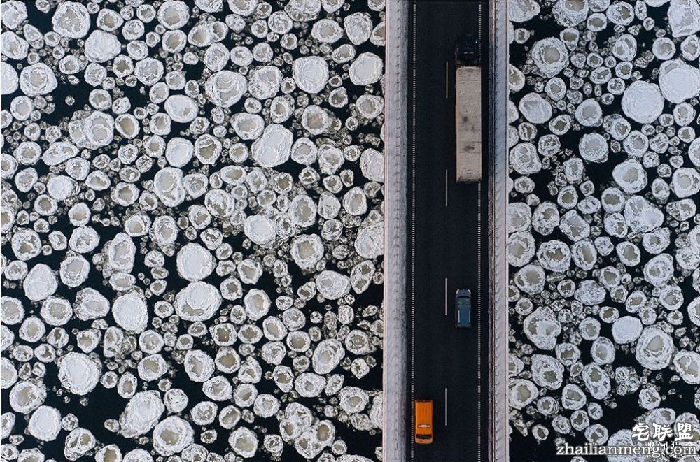 1. 底下是结冰河流的桥俯瞰图。