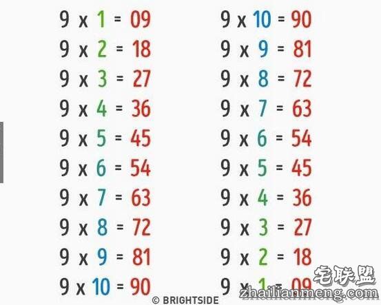 ▼九九乘法表里,9x3=27,9x8=72,乘积刚好是颠倒的数字!只有9的乘积是这样。