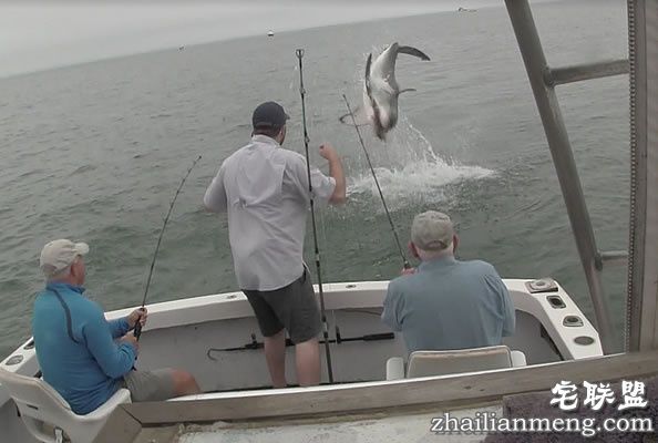 美国一位船长12日一如往常带游客从Orleans 石头港出港海钓,当一条鱼逐渐被拉近时,一条大白鲨突然跃出水面。
