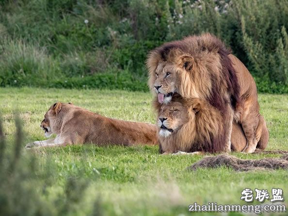 趴在上方的公狮还摆吐舌表情、 下方的公狮则是一脸陶醉,而目睹这一切的母狮则是尴尬地别开头,似乎想要眼不见为净。