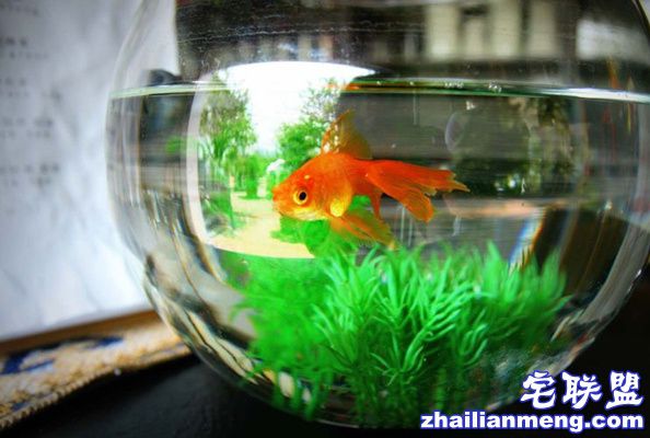 在照片中,一条金鱼在透明鱼缸中游泳,旁边的纸条写着,一个人在房间,想要个伴? 租条鱼吧,一晚3.5欧元。