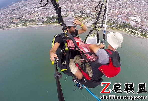 Kadir Mert 和朋友Tunahan Korucu 在土耳其一个海岸城市玩滑翔翼,而两人带着渔夫帽相对而坐,在150米的空中摊开红色野餐布,上面放着马克杯。