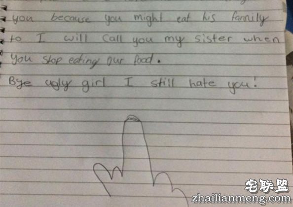 国外一名女孩Louisa Naau Taukeiaho 日前在自己的facebook 分享一张照片,这是她的妹妹写给她的一封信。从信件内容看到,妹妹画了一个比中指的图案,而且还写不少自认为最狠毒的话,当中包括我恨你、这就是你为什么没有朋友的原因、我希望你嫁不出去等。