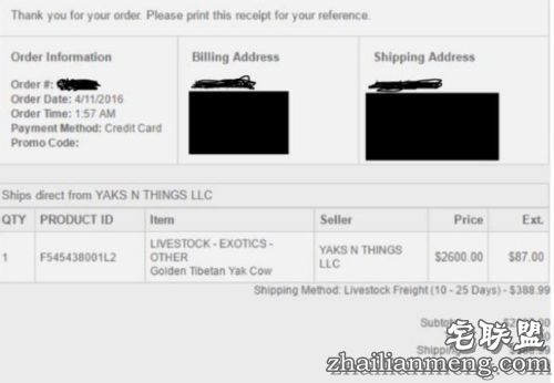 账单显示,牦牛价值2687美元,加上运费约389美元,总共约3076美元。