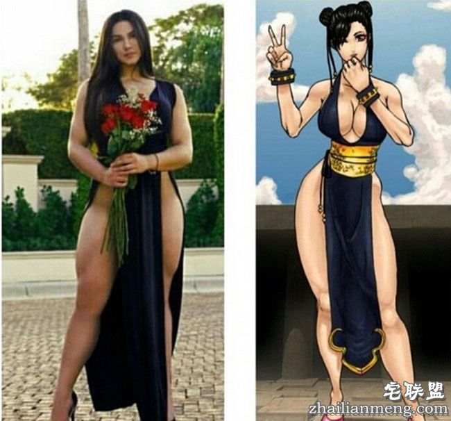 上月娜塔莎在Instagram晒出这张照片便让她火爆网络,照片中妹子身穿黑色高开衩贴身礼服裙,露出粗壮的大腿,竟与游戏《街头霸王(Street Fighter)》的经典角色“春丽”迷之相似!深邃五官配上结实大腿简直太像了,就是现实中的真人版春丽!