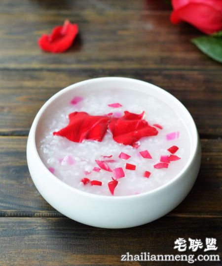 准备1杯白米、新鲜玫瑰花1朵,还有熬得香浓的鸡汤8杯。先将鸡汤煮沸,放入淘净的白米继续煮至滚时稍微搅拌,改小火熬煮30分钟,加入玫瑰花瓣再煮3分钟即可。如果想再加点甜蜜,就放点蜂蜜。这款粥还有美容减肥的功效,玫瑰花具有促进血液循环的功效,能使肌肤光滑,而蜂蜜一遇热会使蛋白质等营养素转化为蛋白酶,使肠胃急速蠕动而减少过度吸收,有助于减肥。