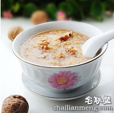 取5个胡桃仁捣碎,与100克粳米一同煮成粥,并加入少量红糖搅拌均匀,于早晚食用。