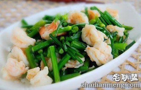 制法:将虾去肠去壳,爆香姜片,放入鲜虾炒熟。韭菜略炒,与虾一起上碟即可。