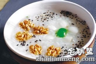 做法:将核桃仁及芝麻各研末,备用。粳米加水煮粥至7成熟,再加入核桃仁、芝麻各30克,煮熟即可。每日分1至2次食用。