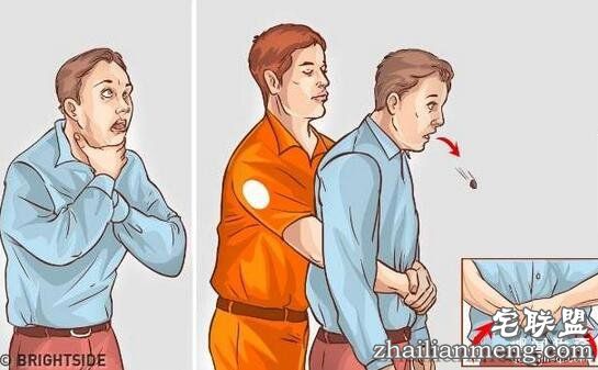 ▼防止被食物噎死,学会哈姆立克法:急救者站在被噎住人的后方,一只手握拳向横隔膜位置(大约在肚脐上方)施压。另一只手握住这只手施压,就像把对方抱起来一样。这样的动作会压缩肺部,强迫异物排出气管。
